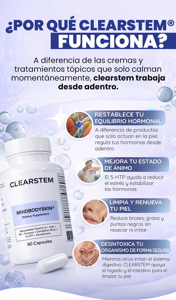 Aquí es donde entra CLEARSTEM® MindBodySkin, el suplemento que ha ayudado a miles de personas a mejorar la apariencia de su piel desde adentro, atacando el desequilibrio interno que provoca los brotes persistentes.